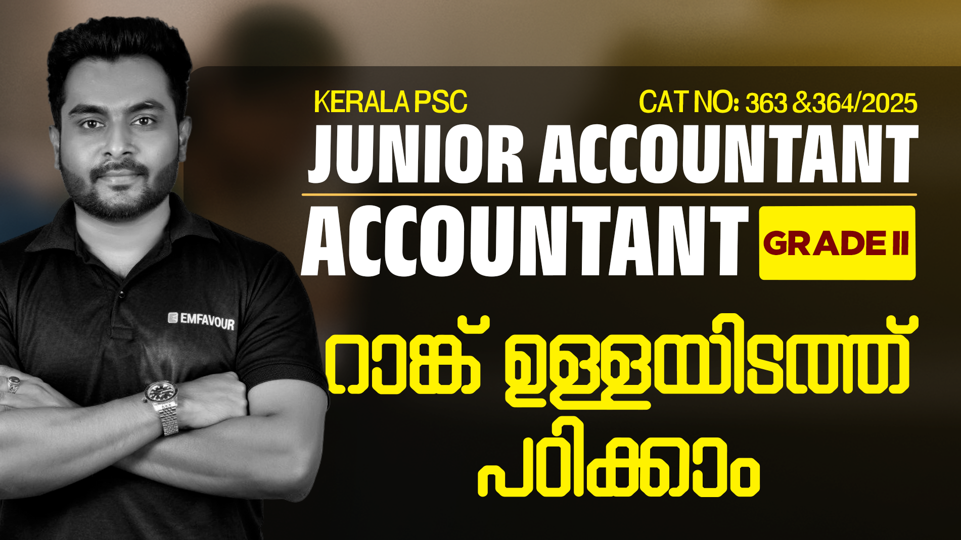 JUNIOR ACCOUNTANT / ACCOUNTANT GRADE II [Complete Syllabus Based Exam Batch] | LIVE at 9 PM Today [3 OCT] JUNIOR ACCOUNTANT / ACCOUNTANT GARDE II [Company/Board/Corporation] പുതിയ ബാച്ചിലേക്ക് പ്രീമിയം ഫീച്ചർസോടെ പരീക്ഷ തയ്യാറെടുപ്പ് നടത്താം. SPECIAL OFFER സ്വന്തമാക്കി ബാച്ചിലേക്ക് ജോയിൻ ചെയ്യാനായി വിളിക്കുക 8891949239, 9747201900 Course Payment & Details (Direct LINK) -http://https://courses.emfavour.com/products/junior-accountant-accountant-gr-ii-complete-exam-course-2025-26/